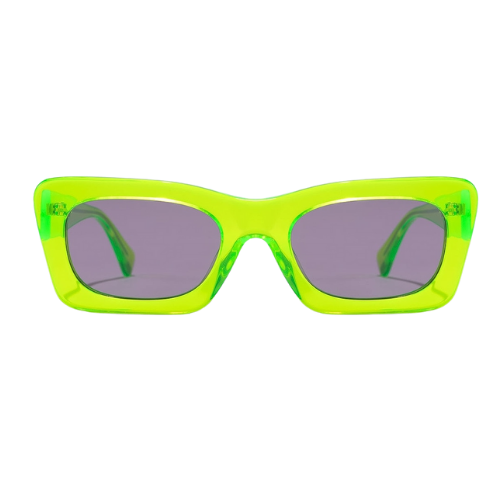 Estas gafas de sol tienen una combinación ácida de marcos transparentes de color verde limón y lentes cosméticas de color púrpura, inspiradas en la tendencia de moda retro de neón de los años 80 de esta temporada. La delgada silueta rectangular de borde grueso se remonta a los años 90.